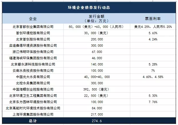 對于環(huán)境企業(yè)而言,發(fā)行債券是一種常見的融資手段,據(jù)不完全統(tǒng)計,2018年以來,環(huán)保上市企業(yè)的債券發(fā)行規(guī)模至少達(dá)到274.6億元人民幣。