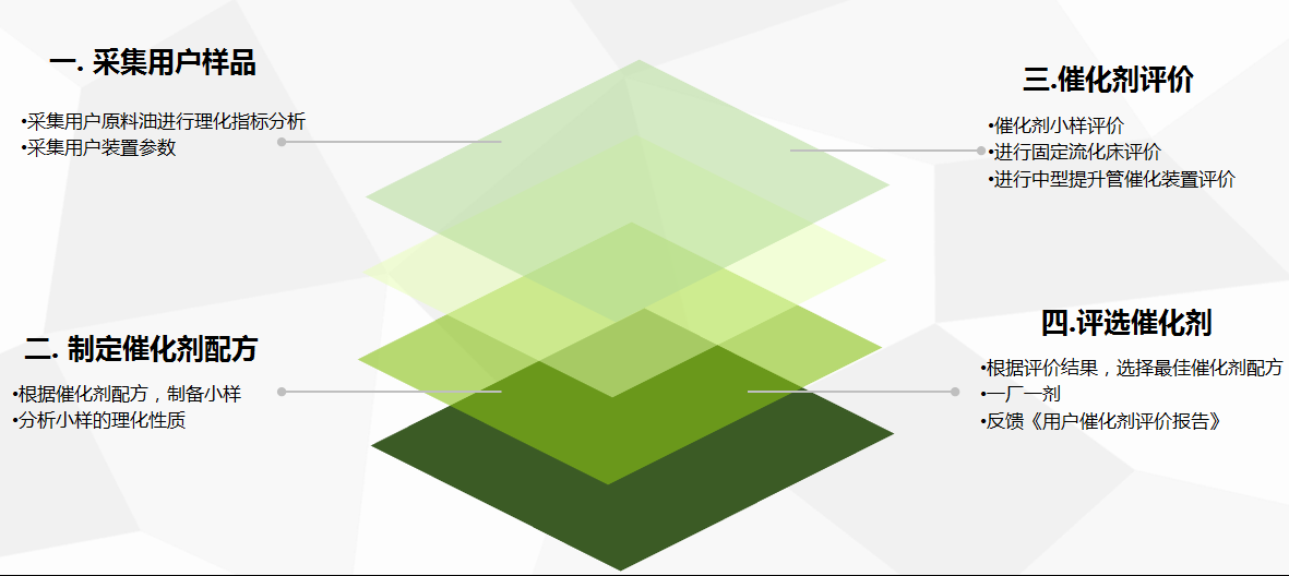 銷(xiāo)售人員負(fù)責(zé)售前采集客戶(hù)生產(chǎn)工藝數(shù)據(jù)、原料油樣品等,然后交由技術(shù)服務(wù)中心分析,研發(fā)部根據(jù)分析結(jié)果制備催化劑小樣,通過(guò)重油微反實(shí)驗(yàn)裝置、固定流化床實(shí)驗(yàn)裝置和中型提升管催化裂化裝置,對(duì)催化劑配方篩選和工藝效果實(shí)施三級(jí)評(píng)價(jià),根據(jù)評(píng)價(jià)結(jié)果靈活調(diào)整催化劑配方重復(fù)試驗(yàn)并選定最優(yōu)方案交由生產(chǎn)管理部實(shí)施定制化生產(chǎn)。